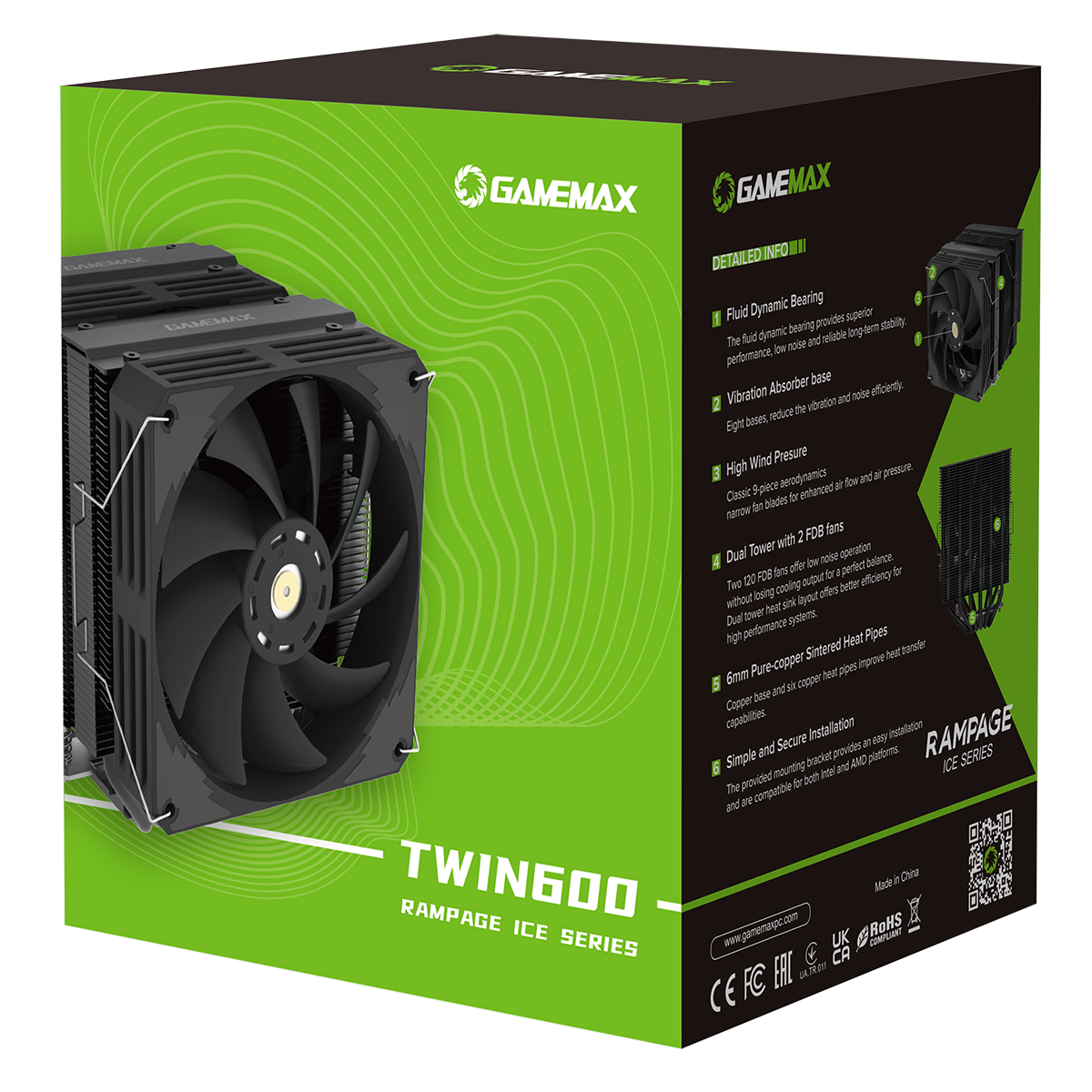 GameMax Twin600 Dual-Tower Black CPU Cooler With 120mm Fluid Dynamic Bearing PWM Fan 6 x 6mm Heat Pipes TDP 250W